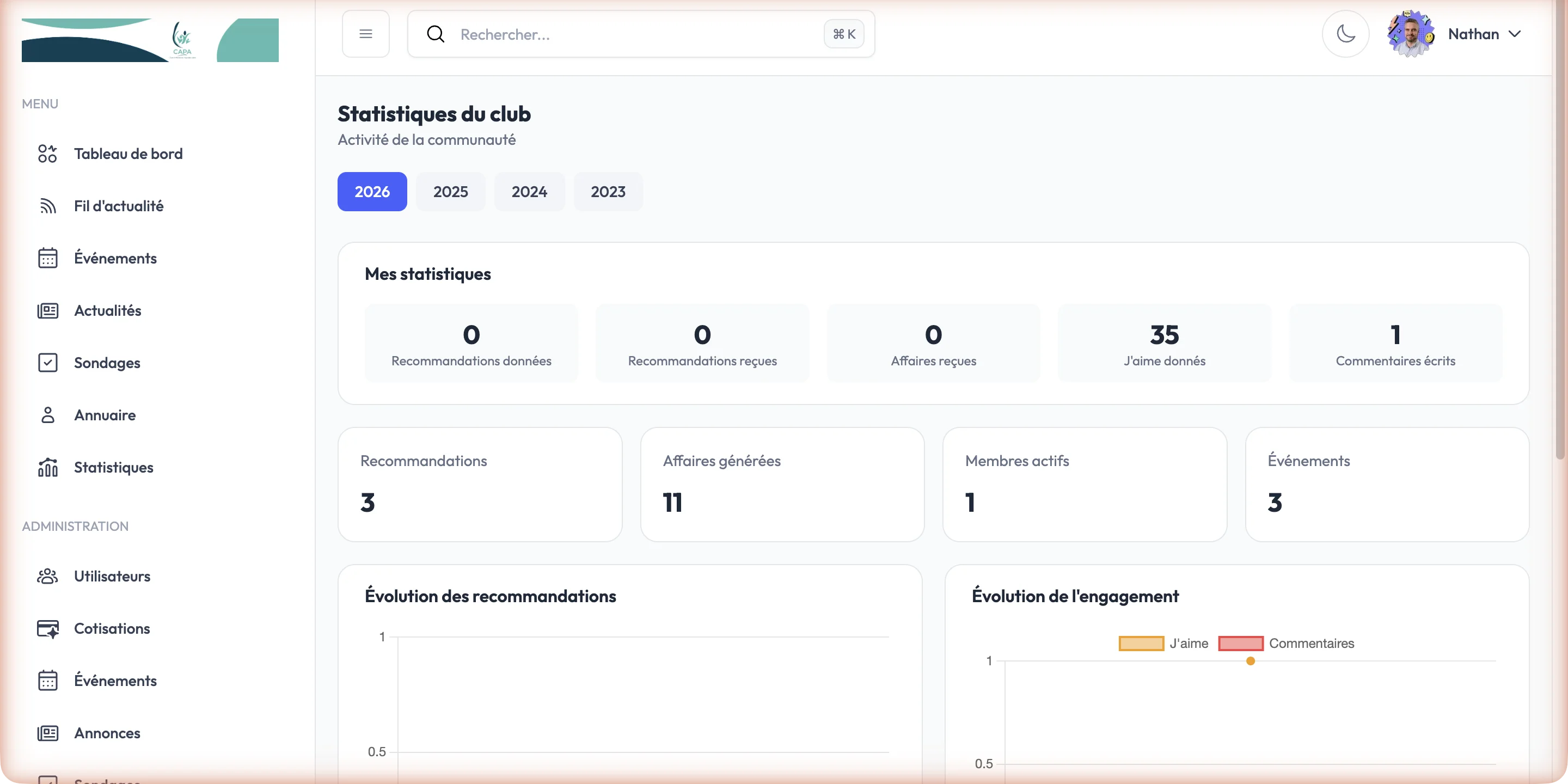 - Tableaux de bord analytiques : suivi de l'engagement des membres, taux de participation aux événements, interactions dans le fil