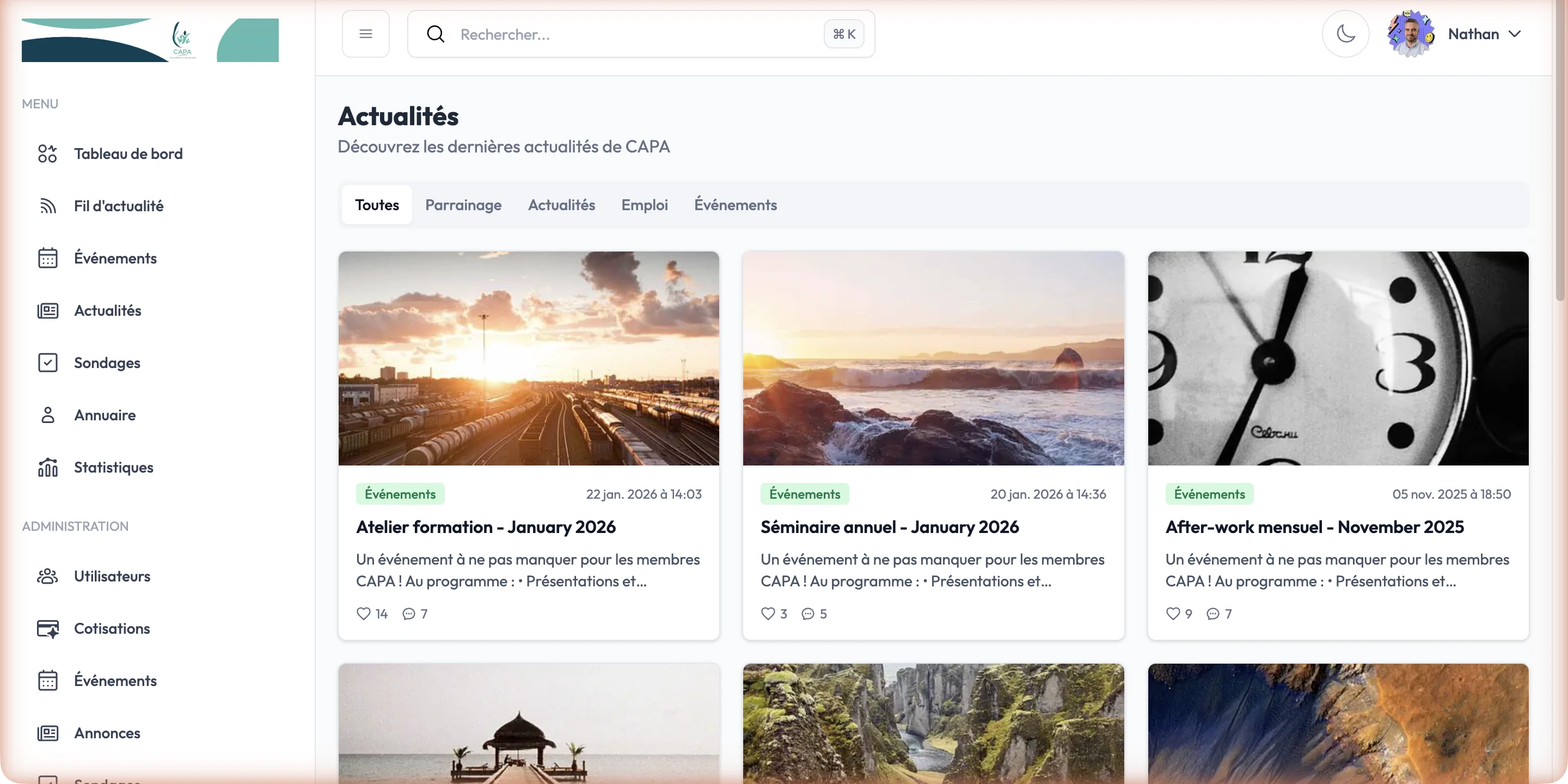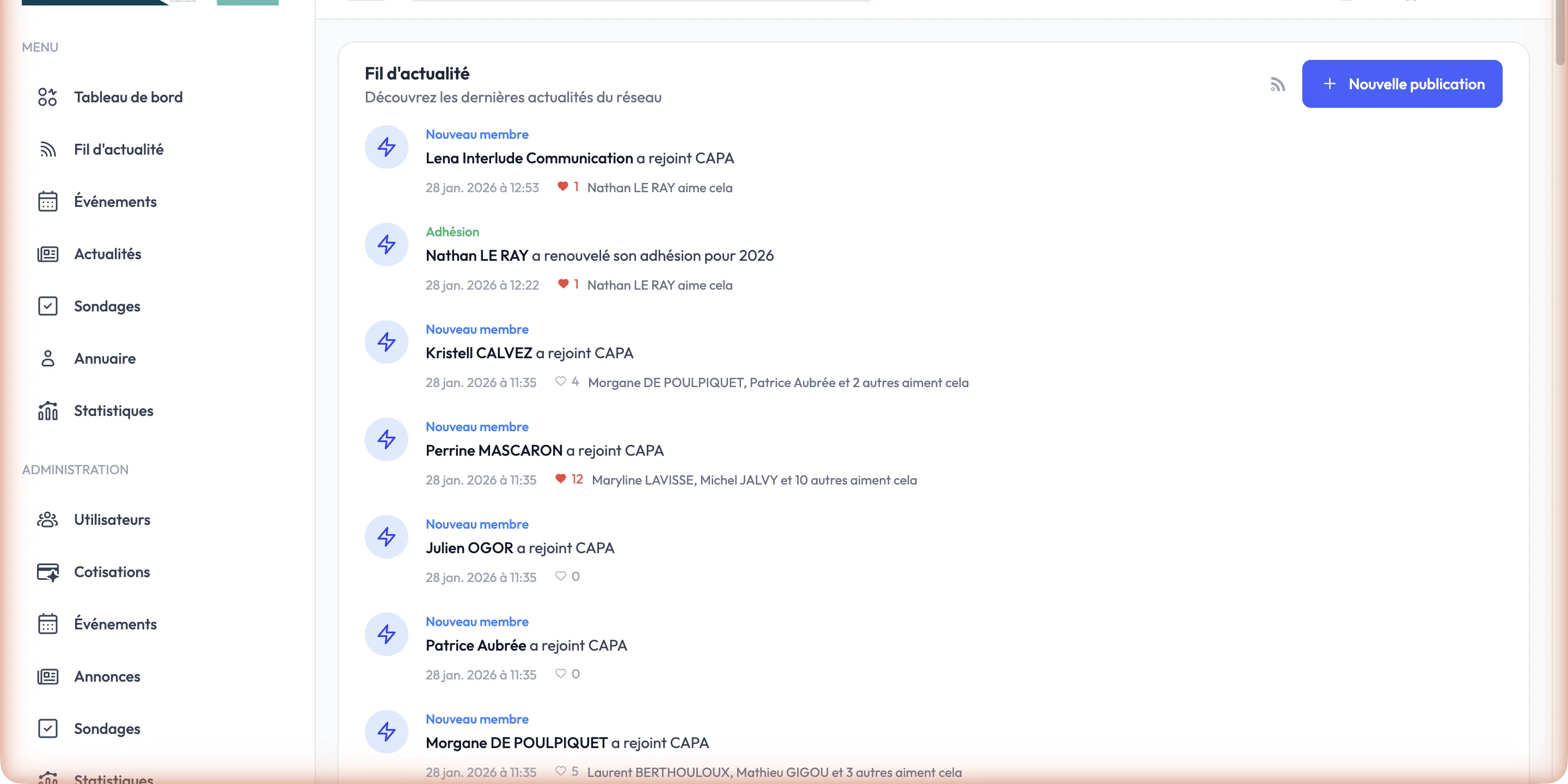 CAPA centralise toute la vie de club dans une seule plateforme : gestion des membres, organisation d'événements, fil d'actualité social, annonces, sondages et analytics. Chaque interaction entre membres est tracée et valorisée, créant un véritable réseau social professionnel dédié au club. Le résultat : un engagement en hausse et une charge administrative en chute libre.