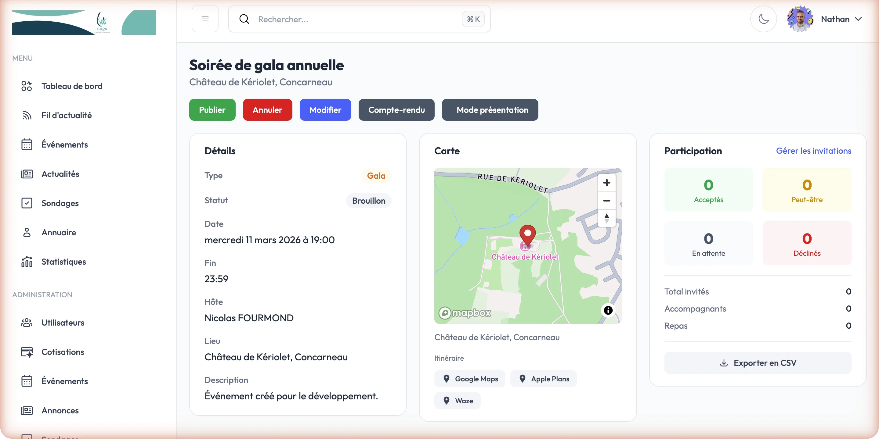 - Comptes-rendus d'événements avec notes et suivi des présences