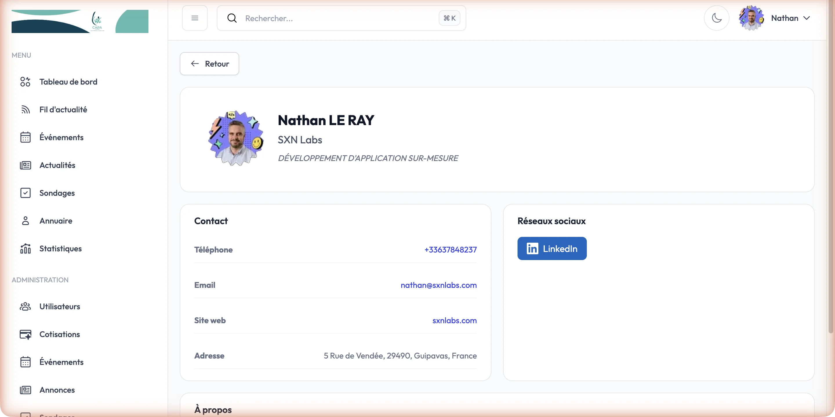 - Profils professionnels enrichis avec avatar, entreprise, coordonnées et liens sociaux